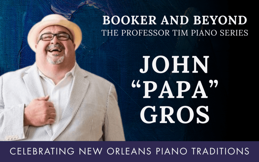 The Ellis Marsalis Center for Music is proud to present a new solo piano concert series, Booker and Beyond: The Professor Tim Piano Series – Celebrating New Orleans Piano Traditions. This series was conceptualized and made possible through a generous bequest by Timothy “Professor Tim” Allspach: educator, musician, and lifelong supporter of New Orleans culture. A friend of piano genius James Carroll Booker, Tim was a beloved teacher at Isidore Newman School for over three decades and a fixture at the Maple Leaf Bar, where his love of music and community flourished. He dedicated part of his estate to celebrate and perpetuate the extraordinary piano traditions of New Orleans. Through this series, we honor his vision by showcasing the brilliance of pianists across genres, ensuring that the spirit of Booker and the city’s rich piano legacy continue to inspire generations to come. Join us on the third Tuesday of each month at the Ellis Marsalis Center for Music for a phenomenal Booker and Beyond show.