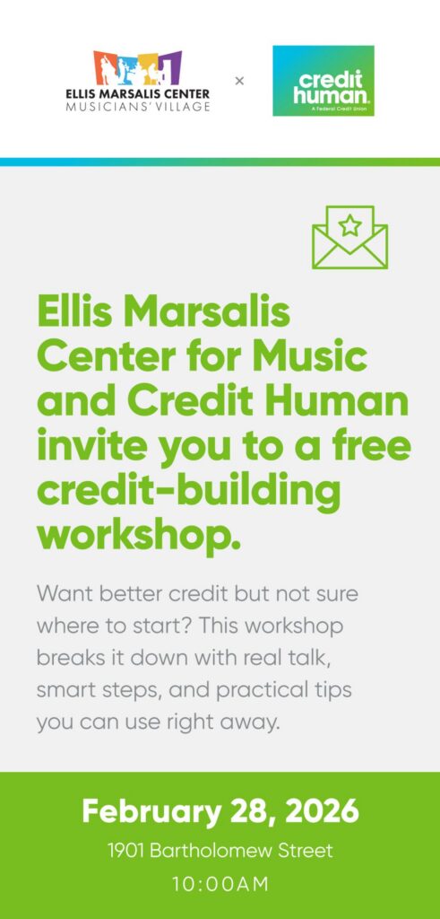 EMCM & Credit Human Present: Credit Workshop 10:00 am – 12:00 pmFebruary 28, 2026 RSVP HERE Ellis Marsalis Center for Music1901 Bartholomew StreetNew Orleans, Louisiana 70117United States of America5049403400View LocationMap Ellis Marsalis Center for Music More information iCal Google View full calendar